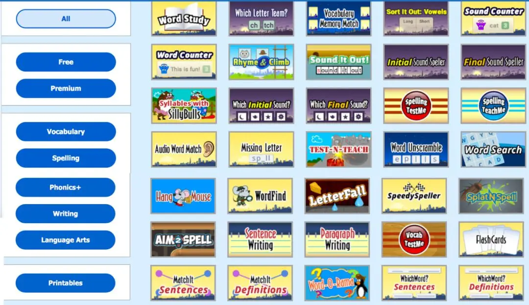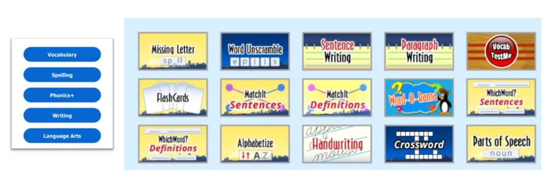 在创建的词汇表之后,网站生成了几十个游戏,同时系统自动按照词汇、拼写、自然拼读、写作等进行了分类。根据想要练习的类型,选择相应的游戏即可。