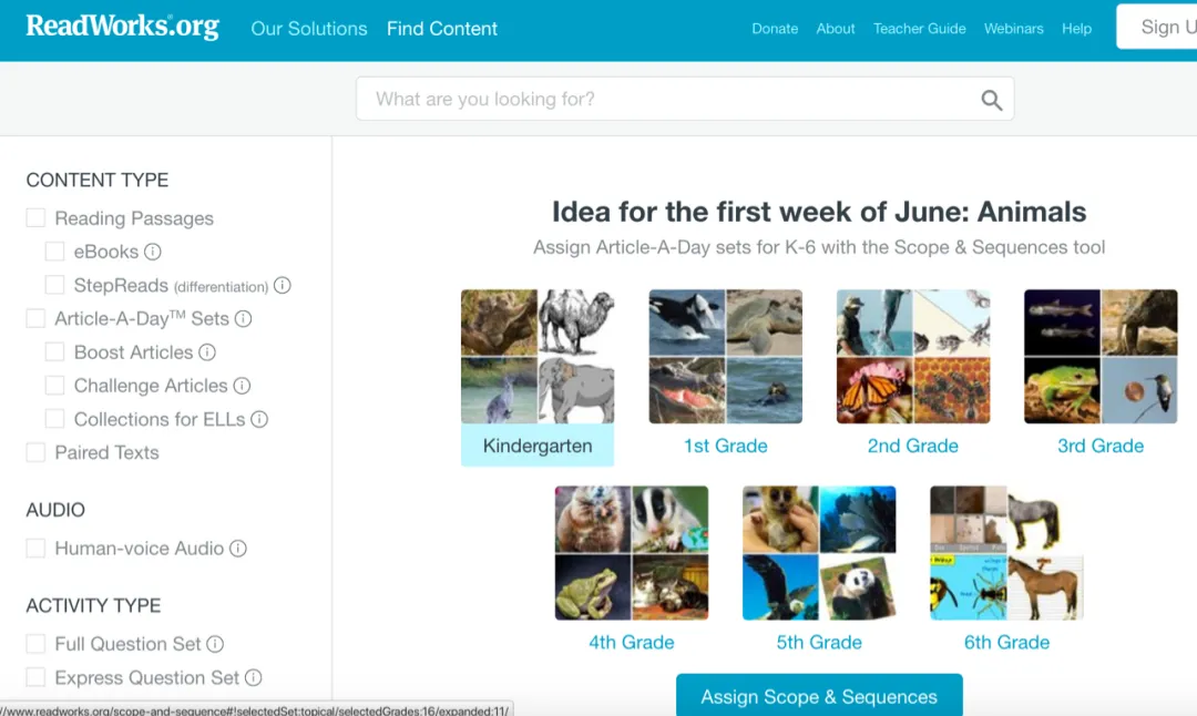 Read Works网站最大的特点就是组织整理了海量的真实英文阅读文本,而且根据阅读难度、学生的年级水平和主题等不同角度进行了分级,并且每一条英文文本都跟美国的英语教学大纲CCSS对应了起来。