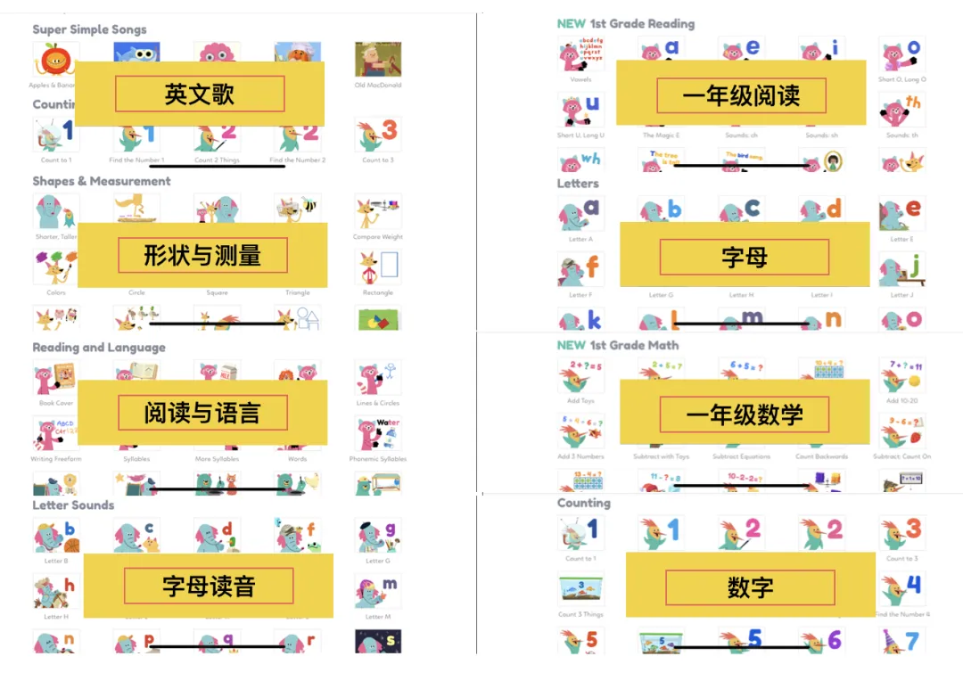 里面的游戏均参照了美国共同核心课程标准,覆盖了英语、数学、艺术、科学等多个学科,以及动物、食物、汽车等孩子们感兴趣的各种主题。