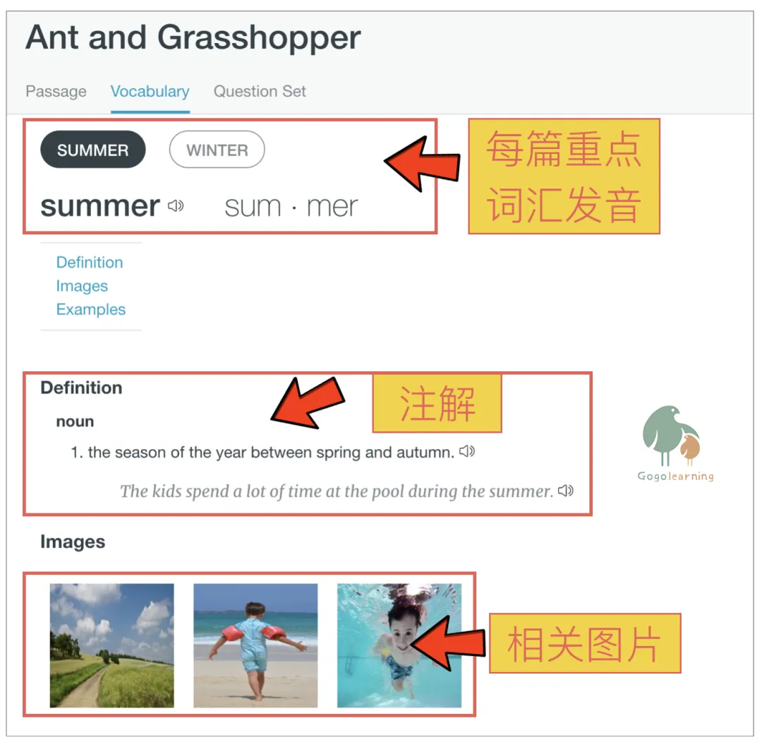 除了听力配套,每一篇文本也基本都搭配了重点词汇讲解,其中包含了发音、释义和相关图片。