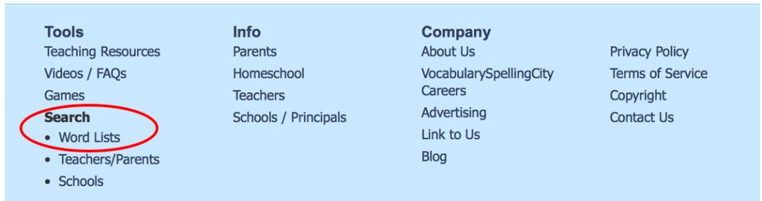 首先,在网站页面最下方找到Search并点击Word Lists。