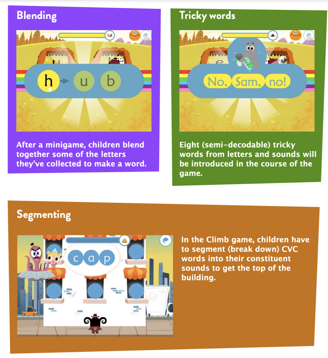 除了字母发音之外,小朋友还可以通过很多趣味小游戏来练习单词的组合(blending)和拆分(segmenting)。一拼一拆,可以熟悉字母和发音之间的对应关系。