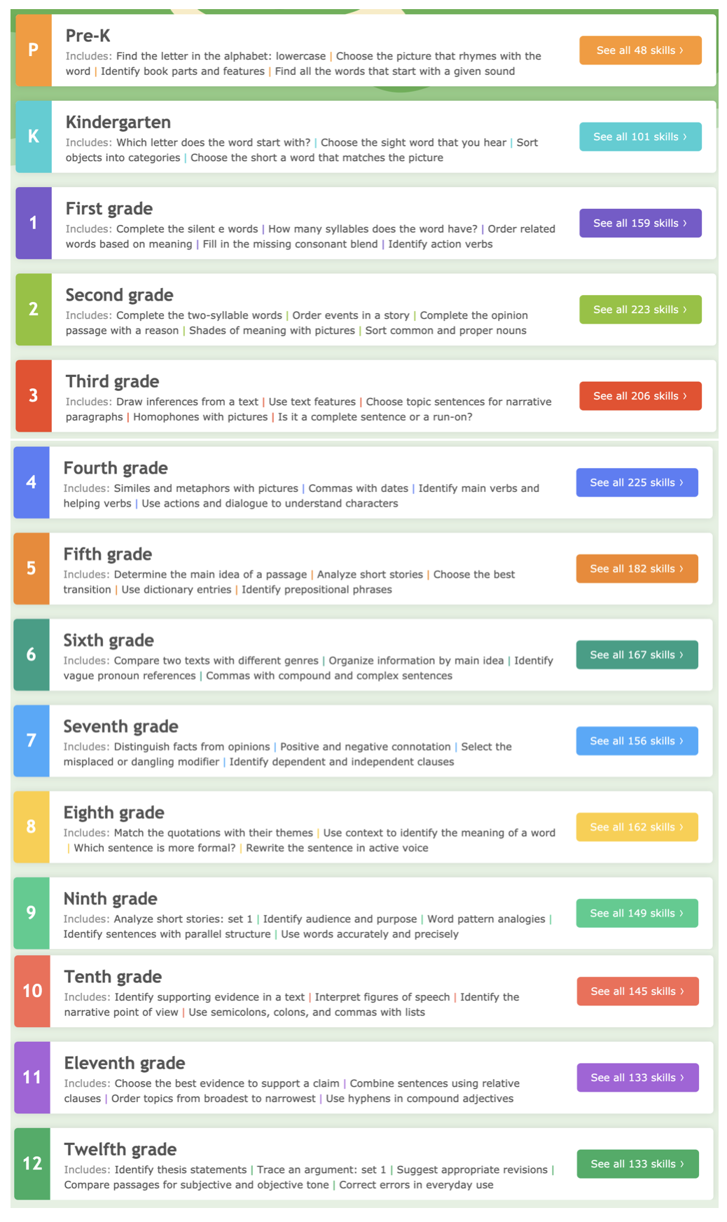 IXL的资源包括了从幼儿园(Pre-K) 到高中毕业十二年级的整个学段。我们只要点击对应的年级,每个年级下面的教学大纲和在线练习都会完整呈现出来。